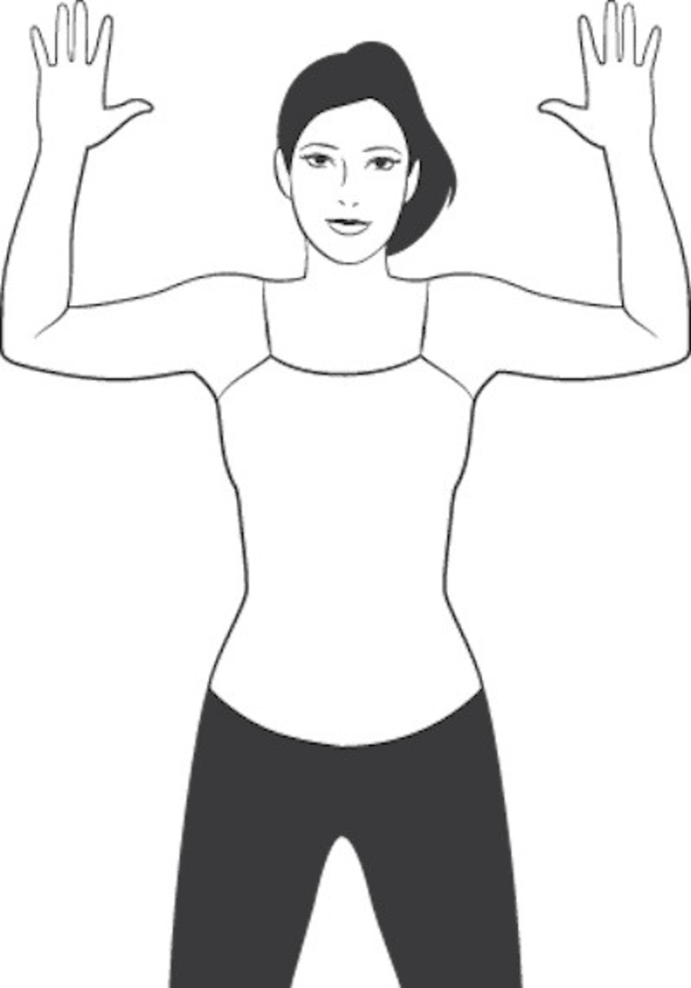 Stand with your back against a flat wall with your feet about four inches from the base. Maintain a slight bend in your knees. Your glutes, spine and head should all be against the wall. Bring your arms up with elbows bent so your upper arms are parallel to the floor and squeeze your shoulder blades together, forming a letter “W” (image at left). Hold for 3 seconds.