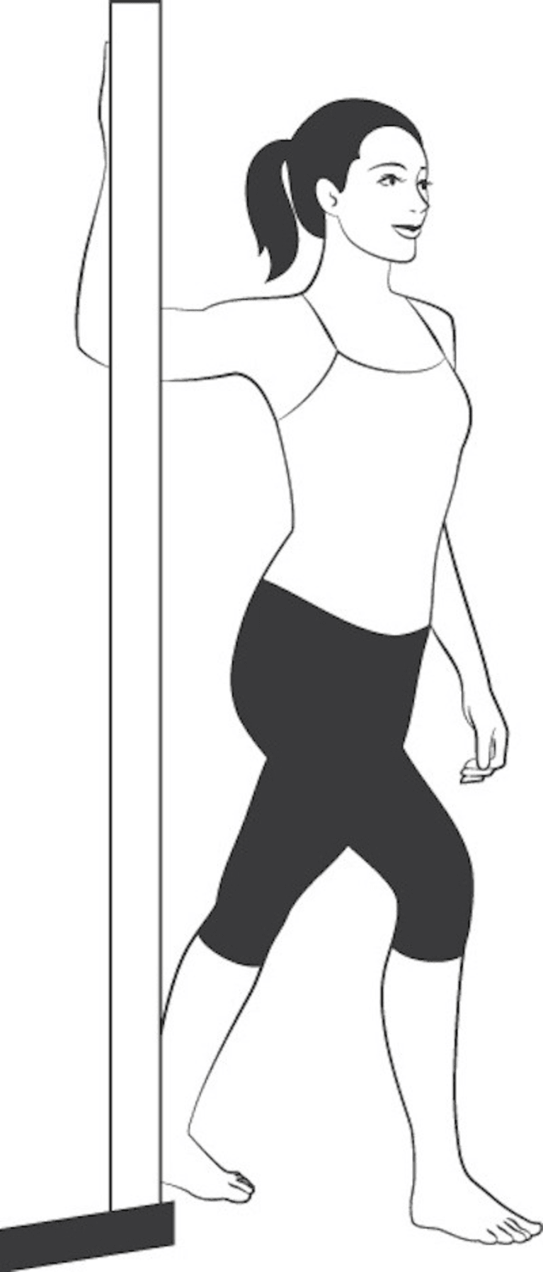 Standing in a doorway, lift your arm so it’s parallel to the floor and bend at the elbow so your fingers point toward the ceiling. Place your hand on the doorjamb.