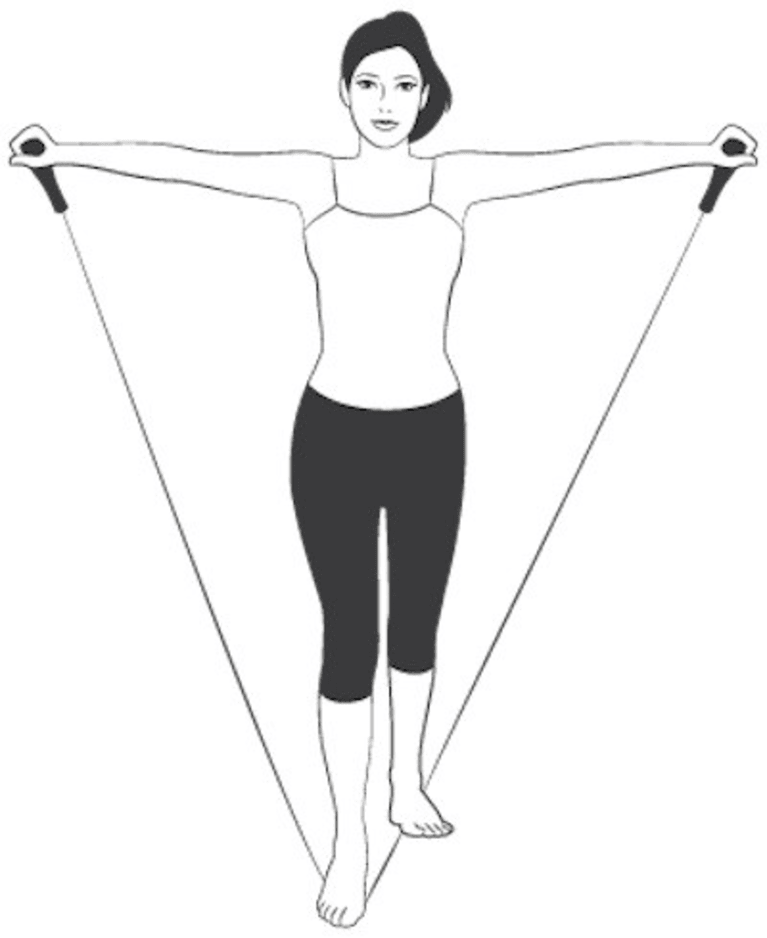 Pull the ends of the band toward your hips, bending your elbows so they point backward (image at left). Hold and slowly return. Do 8-12 repetitions for three sets.