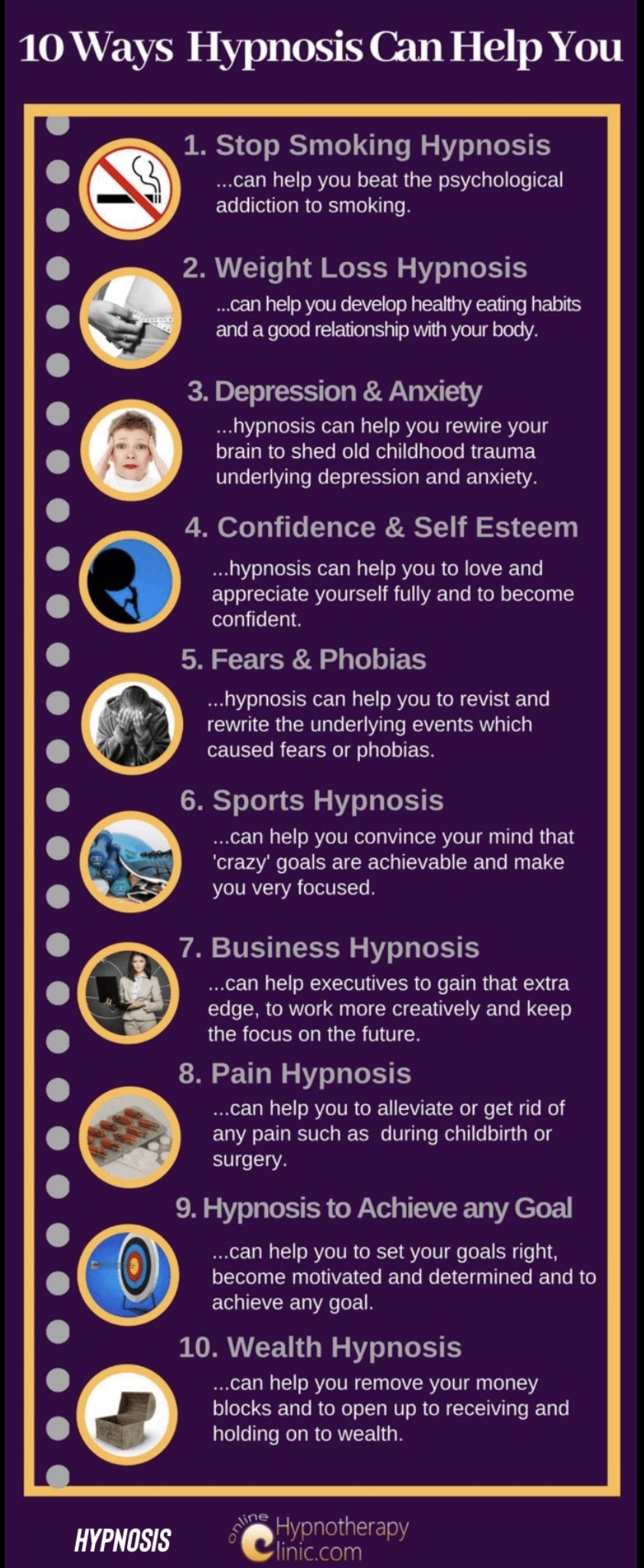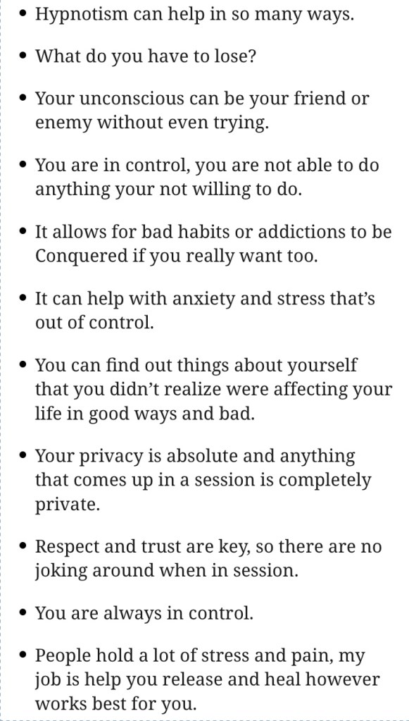 I’ve always had a fascination with hypnotism and the powers of the mind, How it can fight us like a child and not allow us to happy or content with our lives. Using hypnotism I have been able to help people from all walks of life heal and benefit from my work. I empower people and give them tools to get over or come to terms with the problem there having difficulties with.
